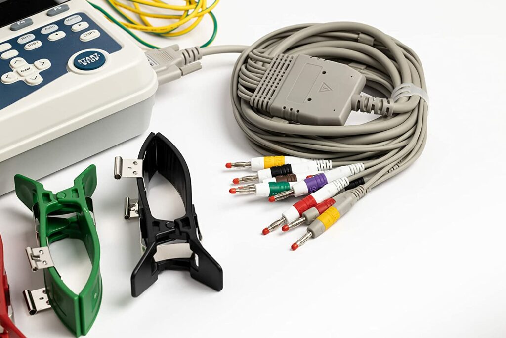 Inclus à l’achat : 1 câble patient, 4 électrodes d’extrémités, 6 électrodes thoraciques, 1 adaptateur secteur et câble d’alimentation, 1 rouleau de papier thermique, 1 manuel d’utilisation
